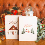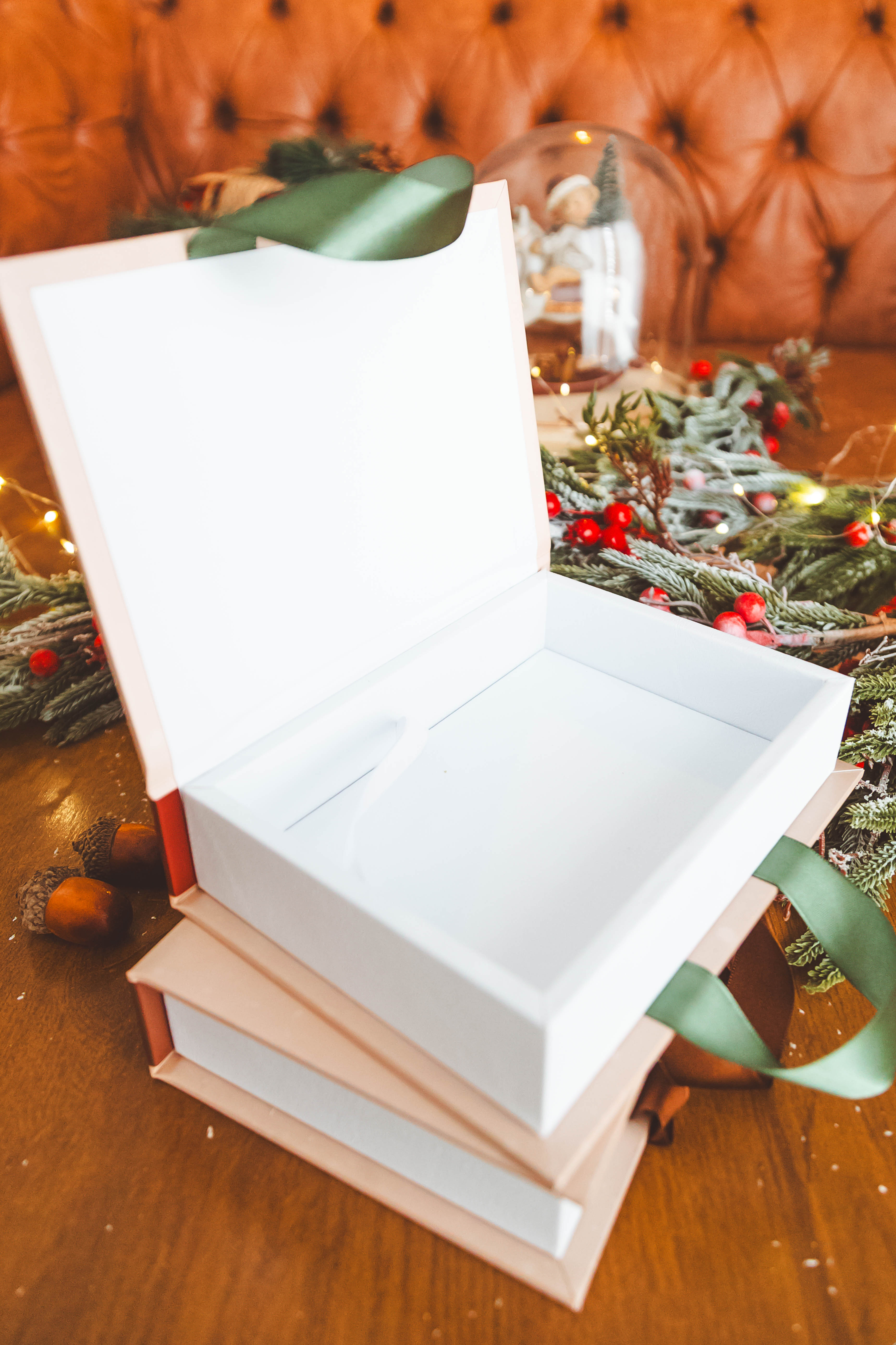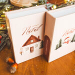 Caixa para fotos nos tamanhos 10×15 e 15×21, com capa fotográfica (tema natalino) e revestimento do aro da caixa em corino branco.