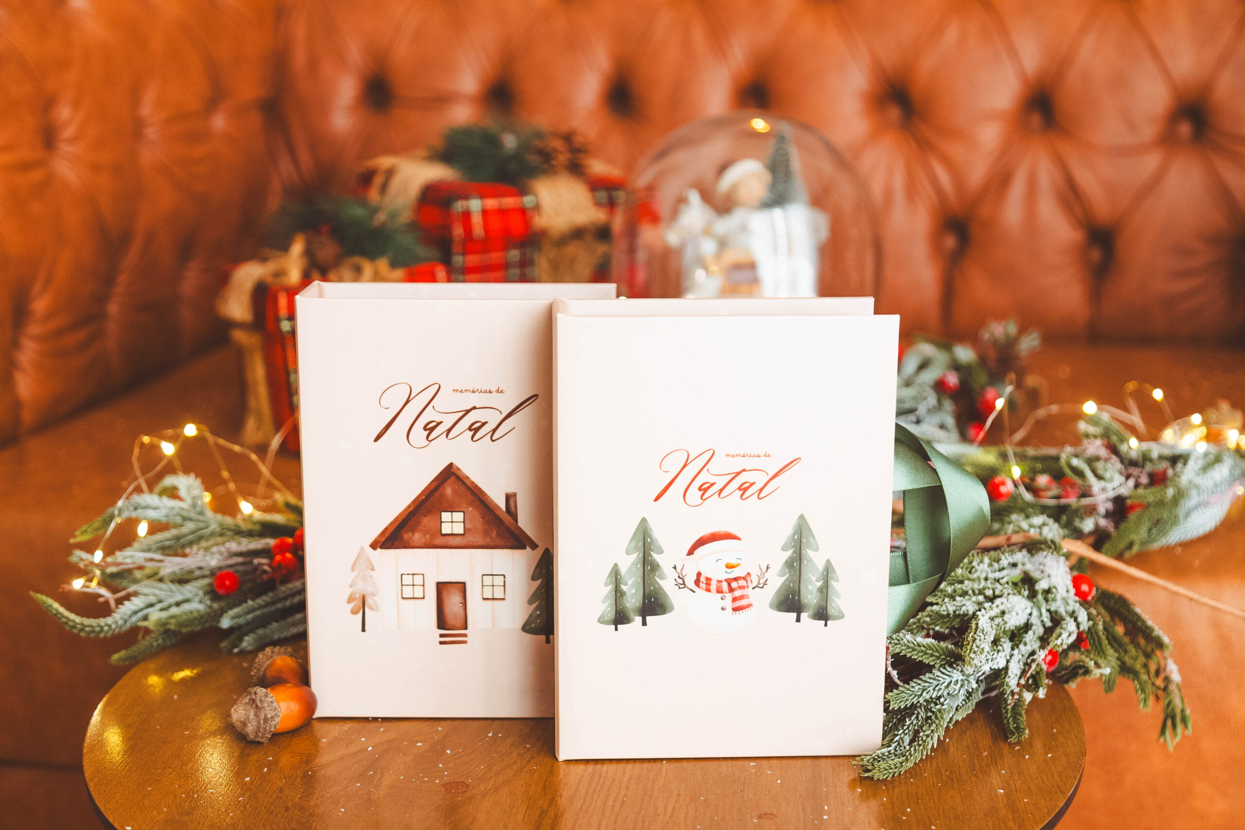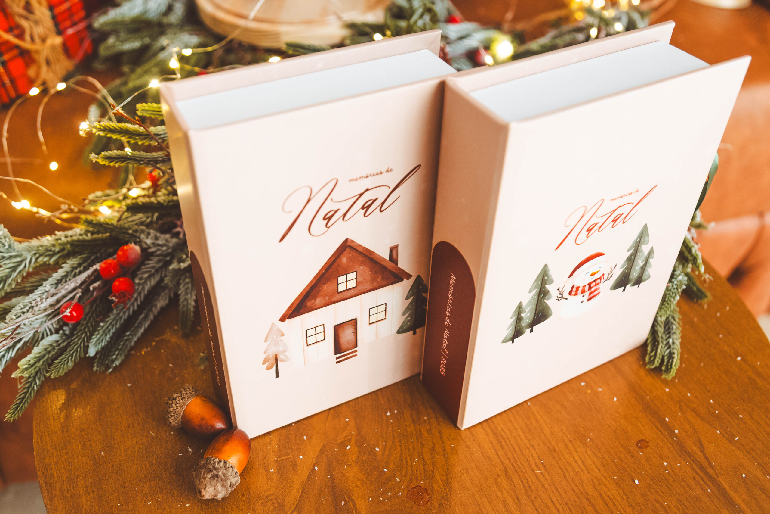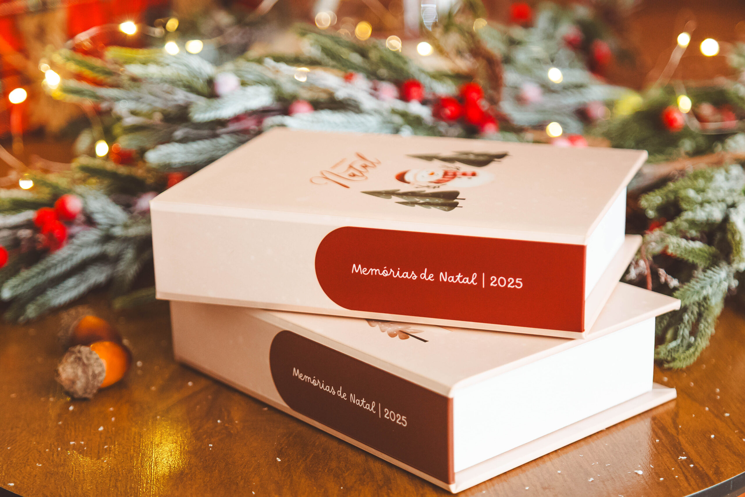 Caixa para fotos nos tamanhos 10×15 e 15×21, com capa fotográfica (tema natalino) e revestimento branco.